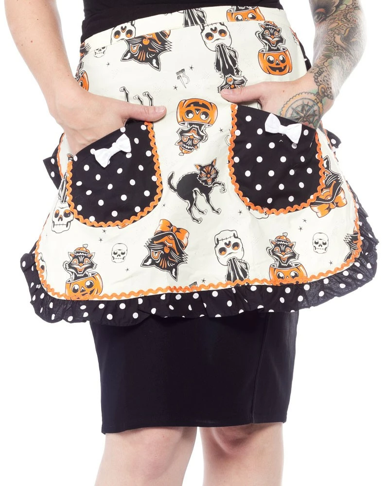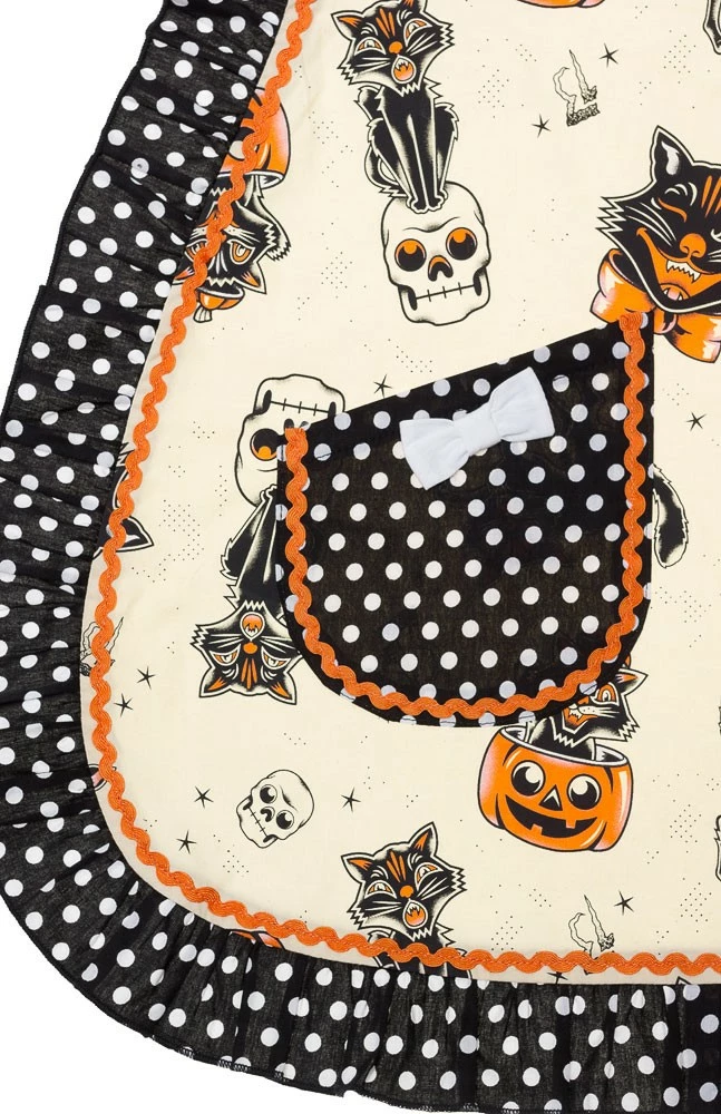 Black cats have gotten stuck with such a bad reputation. Sure they like to party a lot… eat, drink, yell… sit on things they shouldn’t and crawl in things they can’t get out of… oh, and there’s that whole “unlucky” thing, but Halloween wouldn’t be the same without these kitties running amok! So, celebrate this Halloween with our vintage-inspired Black Cats print, found here on our new apron. Trimmed in orange ric rac and black and white polka dot ruffles, it’s simply too cute to be bad luck!