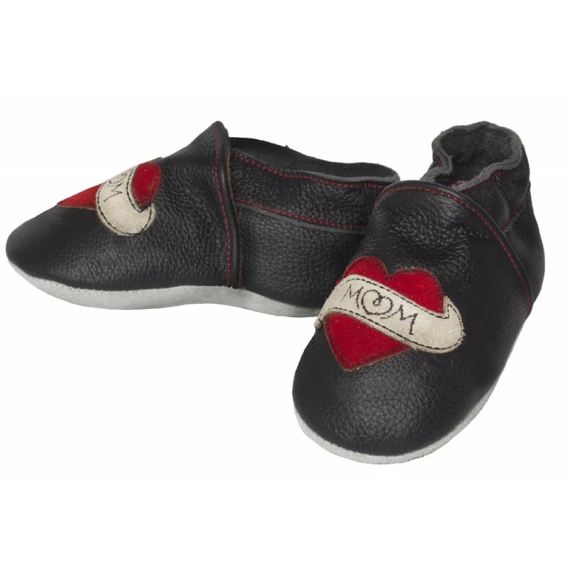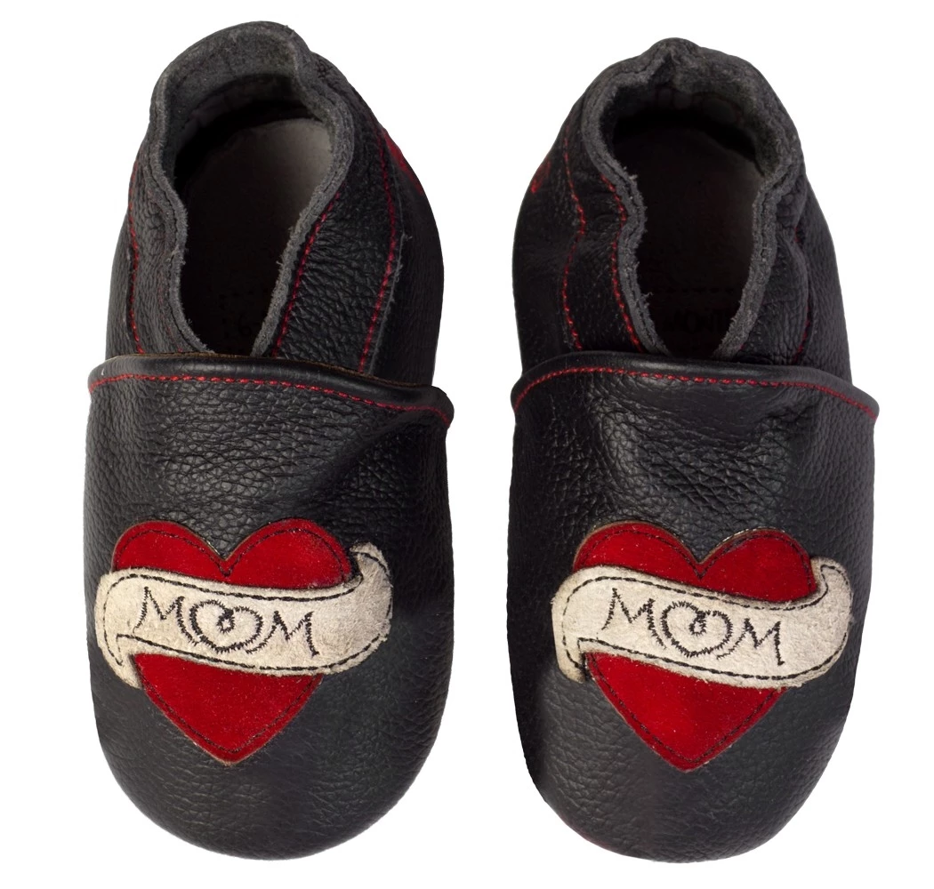 How about some tattoo flash to cover those itty bitty feet with! These super soft & flexible, leather crib shoes features tattooed style Mom applique on each.