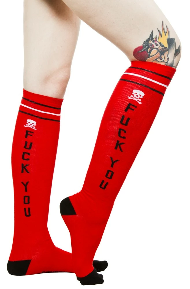 Sometimes you just wanna go and say F*ck You to every person that crosses your path. When you’re in that mood pull up your trusty F*ck You socks from Sourpuss! These varsity style socks feature black & white contrast details, Sourpuss skull logo along with “F*ck You” down each leg.