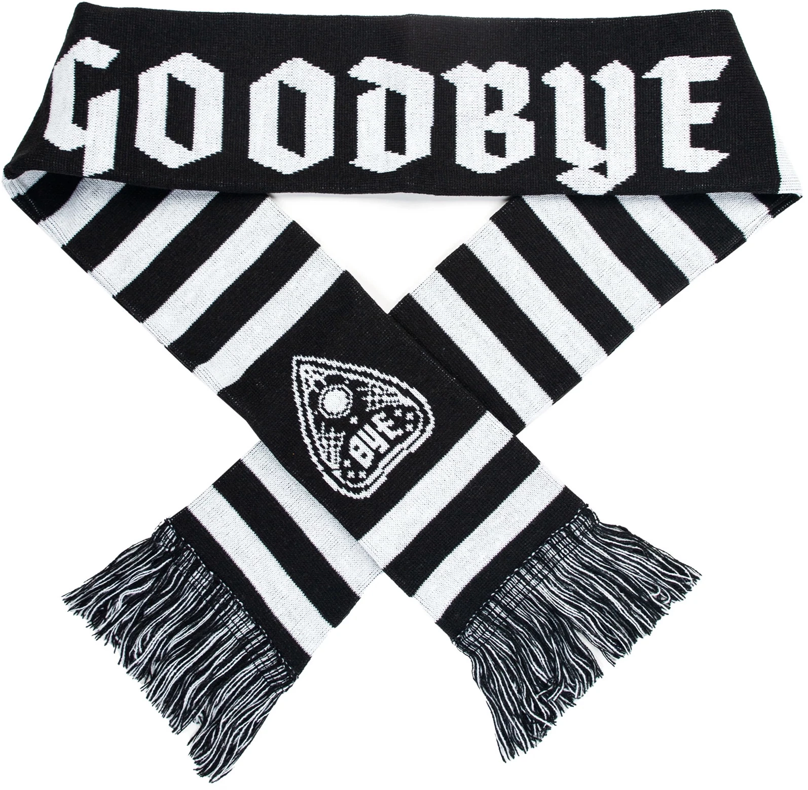 Goodbye! That’s the message you’ll see with this scarf wrapped around your neck. Features jacquard knit ‘Bye’ planchette design on each end of the scarf. Boldly designed in black and white stripes.