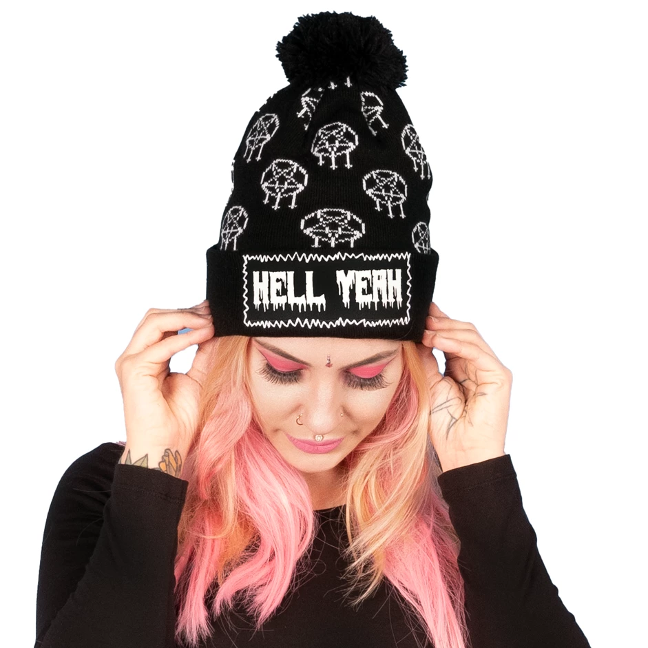 Goth winter wear?? HELL YEAH! Stay warm in style in our pentagram print Hell Yeah Patch Pom Pom Hat