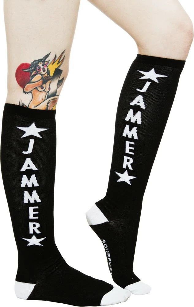 Lead the pack in the Sourpuss Jammer socks! These black, knit over the knee socks feature “Jammer” & a star down each leg with white heel & toe.