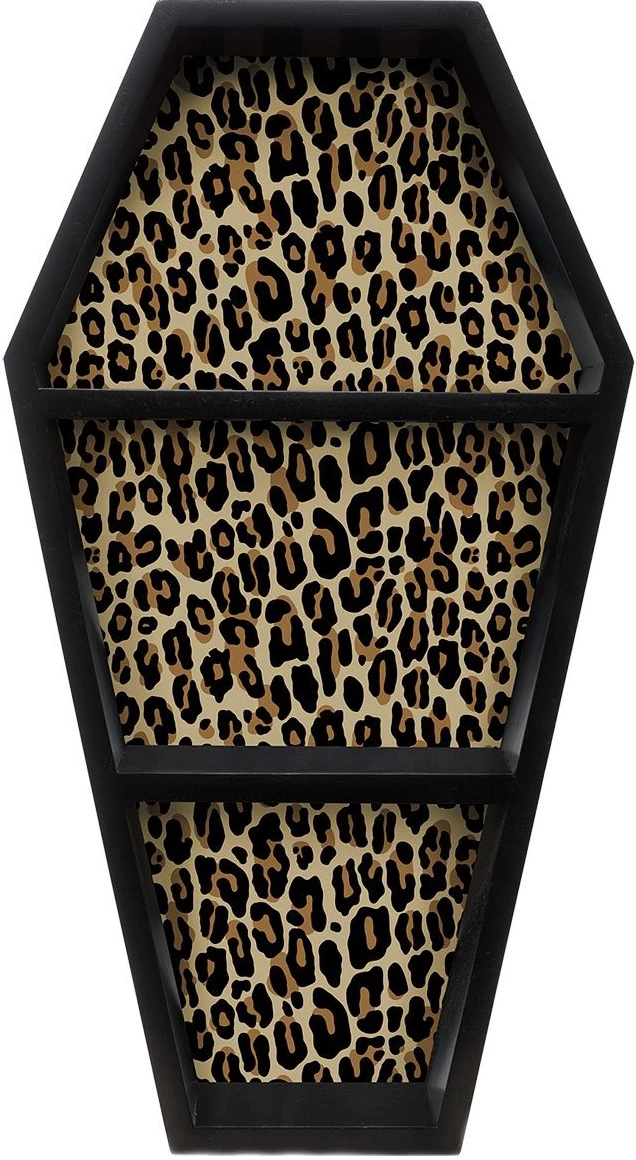 Our coffin shelf has had a makeover. The leopard printed backdrop will ad a little edge to your decor. Display your favorite collectibles or keep your makeup organized.
