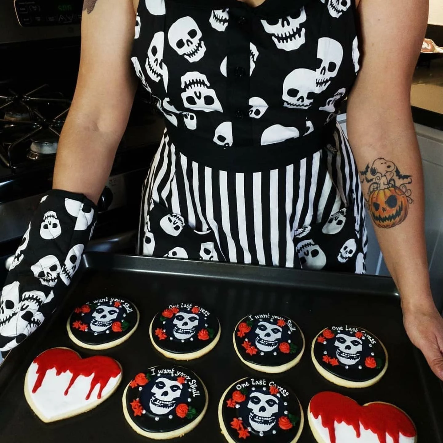 Turn up the music and get lost in your kitchen. It’s time to cook up your favorite tasty treats! Take it up a notch with the Lust For Skulls pattern apron. Nicely detailed with a rounded collar, buttons and two large front pockets for your phone or recipes.