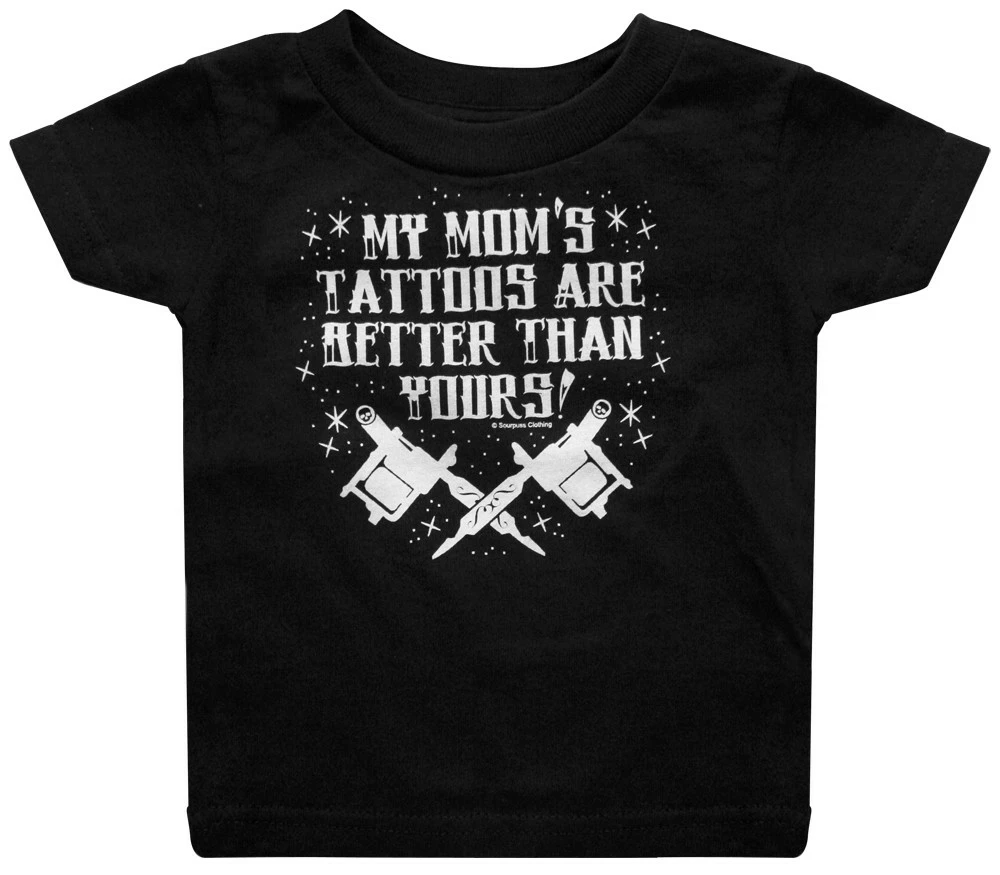 “My Mom’s Tattoos are Better than Yours!” Short-sleeved, kids’ black t-shirt with crossed tattoo machines, stars and dots.