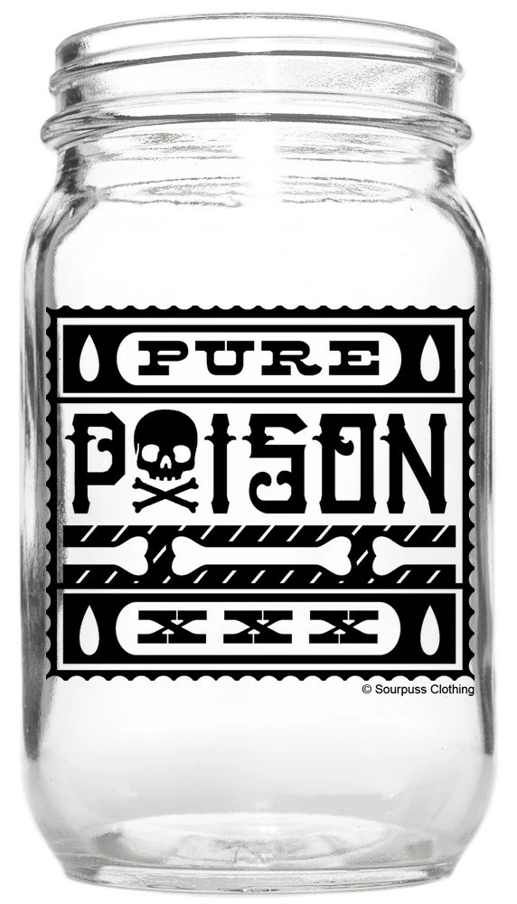 Whether you are sipping some shine or drinking a glass of iced tea, this 230ml mason jar is sure to start a conversation. Screen printed with pure poison on both sides everyone will know not to take a sip out of your glass!