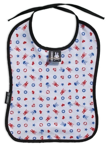 Six Bunnies Bibs have a polyester outer for ease of cleaning and a printed cotton inner for softness – also available with a matching onesie for $24.99