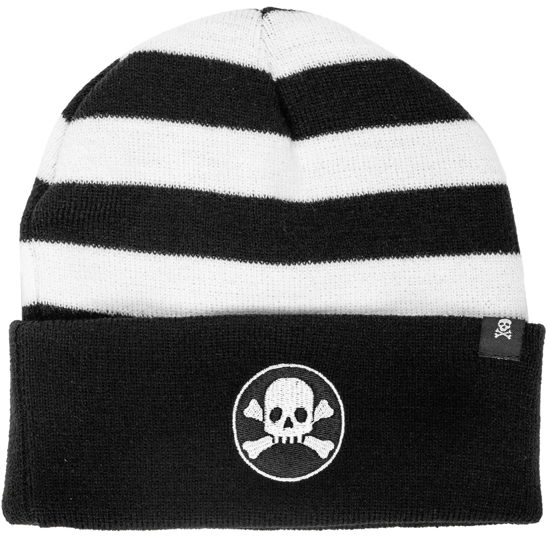 Be bold in the cold and gray days of winter. This soft knit hat has black and white stripes with a skull and crossbones embroidery. Finely detailed with a Sourpuss branded label.