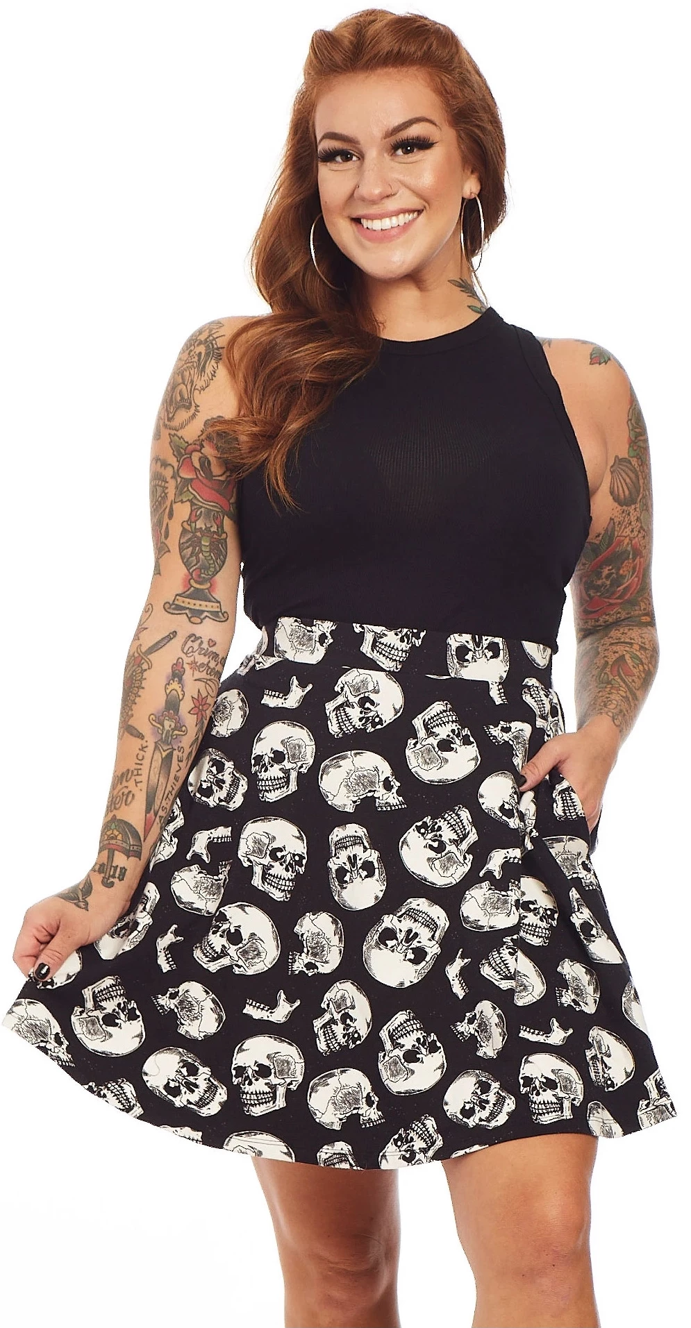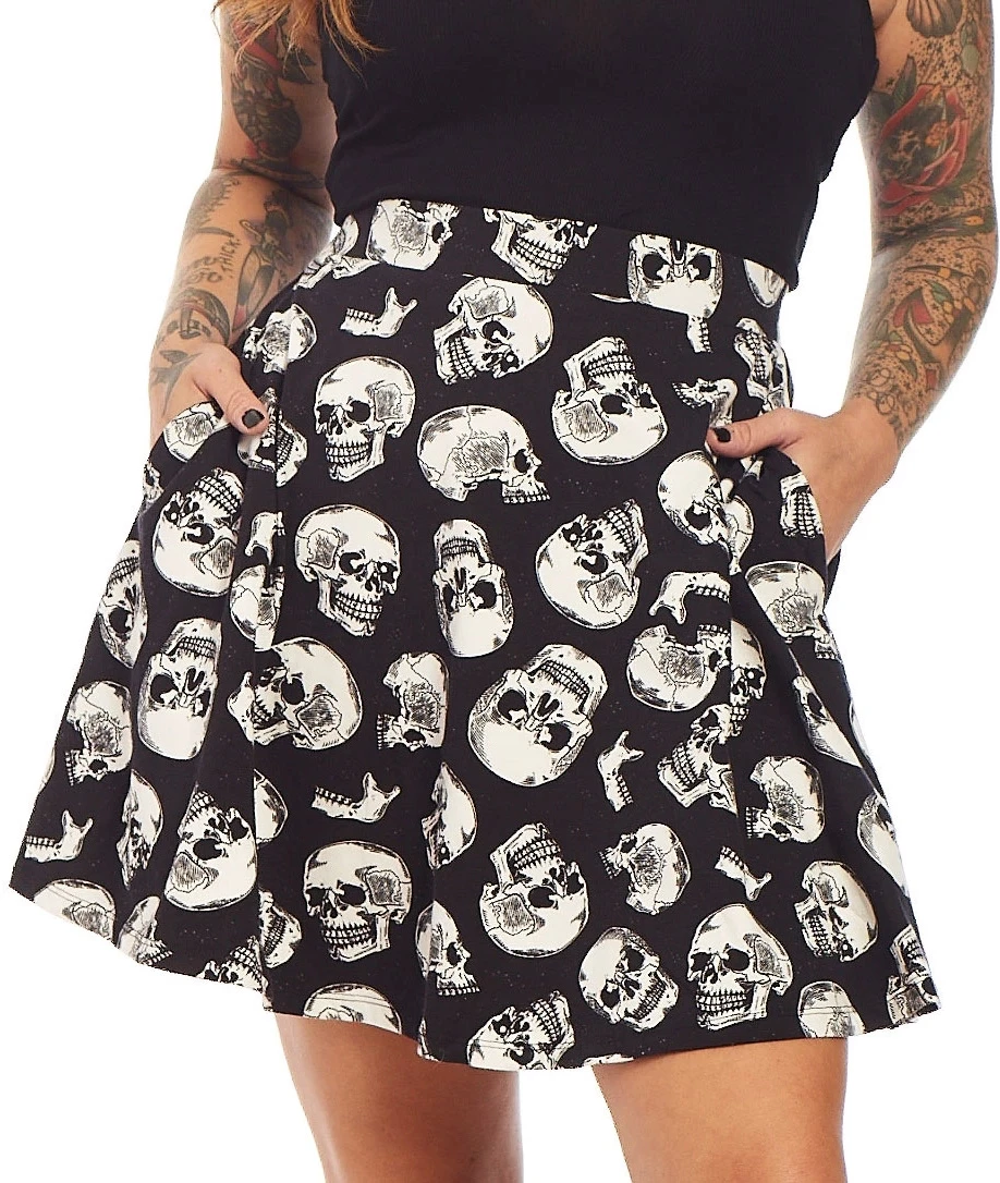 The Skull Duggery skater skirt is just what you need for all your spooky excursions! It pairs perfectly with any top or tee, and is designed to sit at your natural waist. The anatomical skulls are printed using a reactive print, so itβs also super soft to the touch! It has an elastic waistband for a comfortable fit, and best of all, it has pockets!