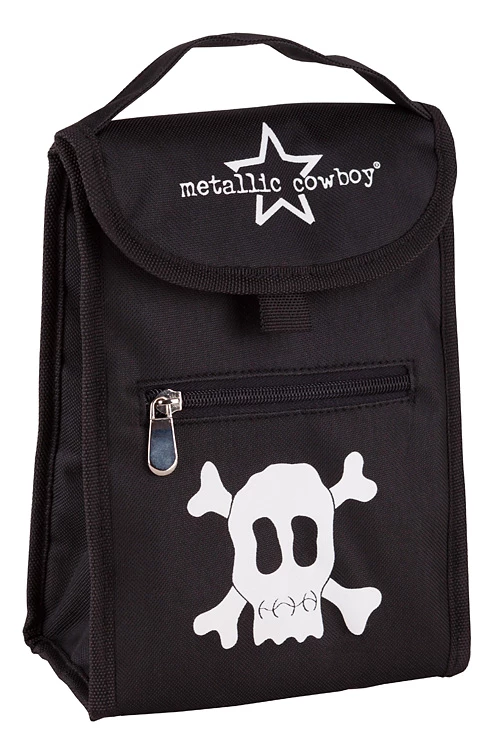 Metallic Cowboy lunch bag measures 18cm wide, 24cm high and has a base of 11cm deep. Fully insulated on the inside with a Velcro opening. Featuring a zipper compartment on the front and a comfortable carry handle. Bag is 100% polyester with silver insulation on the inside.