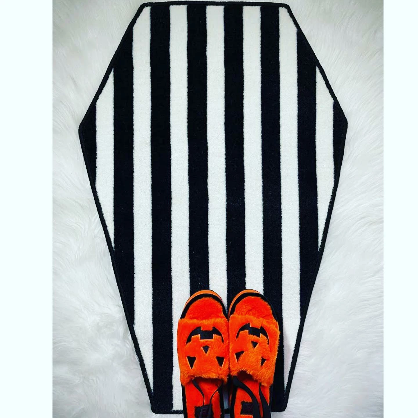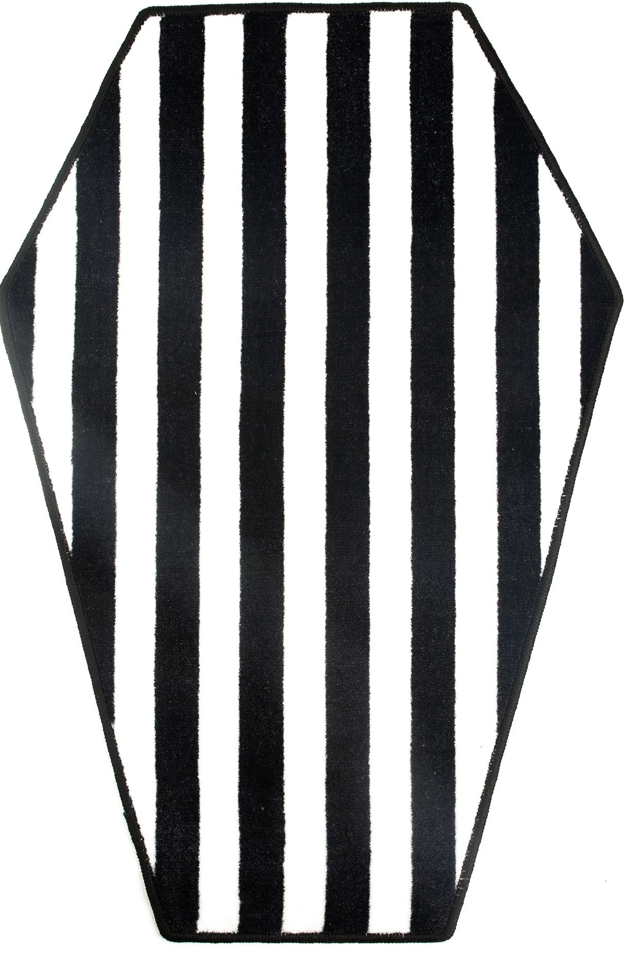 Decorate your crypt with our new Sourpuss coffin shape rug. This is a high pile rug in black and white stripes, it’s luxurious enough to make Lydia Deetz smile!