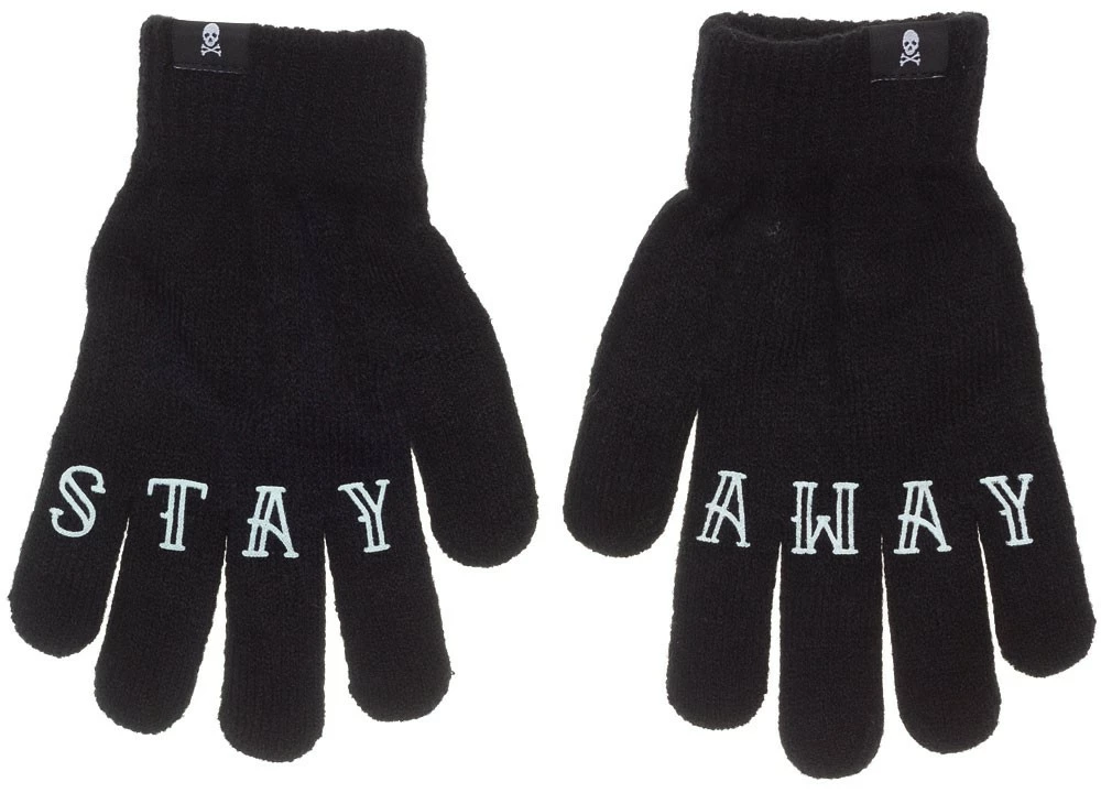 Make friends and influence people with these Stay Away Gloves from Sourpuss! Made of stretch acrylic these gloves feature Stay Away on each hand, Sourpuss logo labels at each wrist, and also have grippy palms for excellent warm beverage holding.Â
