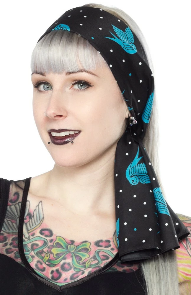 With classic swallow tattoo flash art, this Bad Girl Scarf will be a staple in any pin up’s wardrobe. Our Bad Girl Scarves are the perfect length to wear around your neck or around your ‘do!