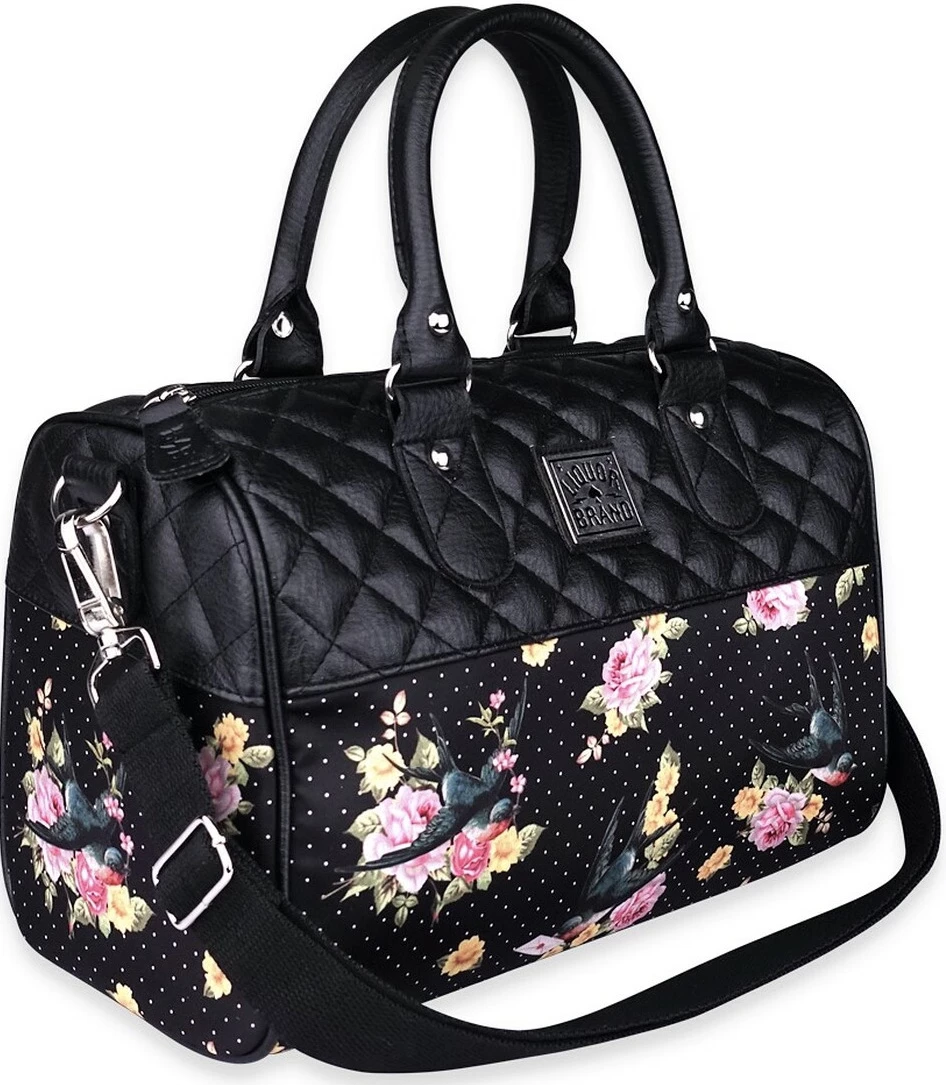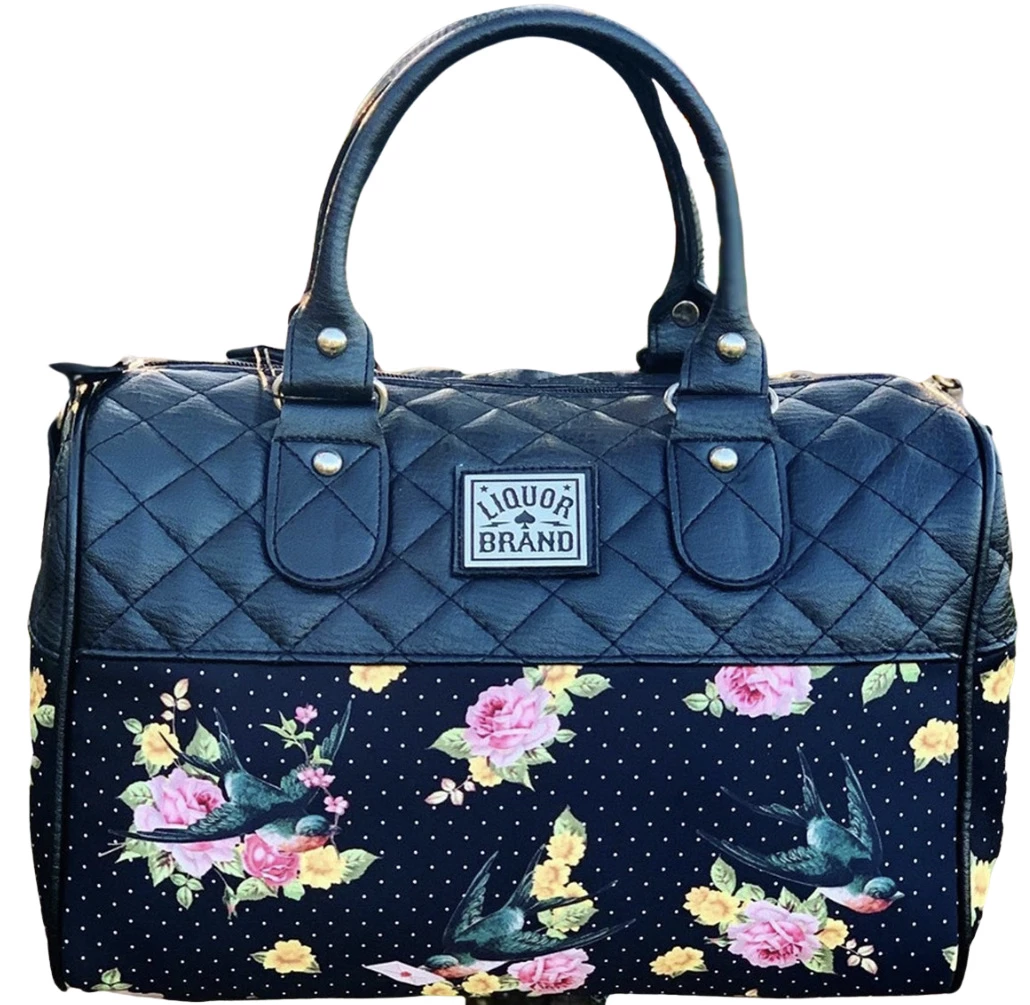 Quilted faux leather, adjustable shoulder strap, satin like sides, foam padding, embossed zipper pullers, metal feet, metal embossed logo plate