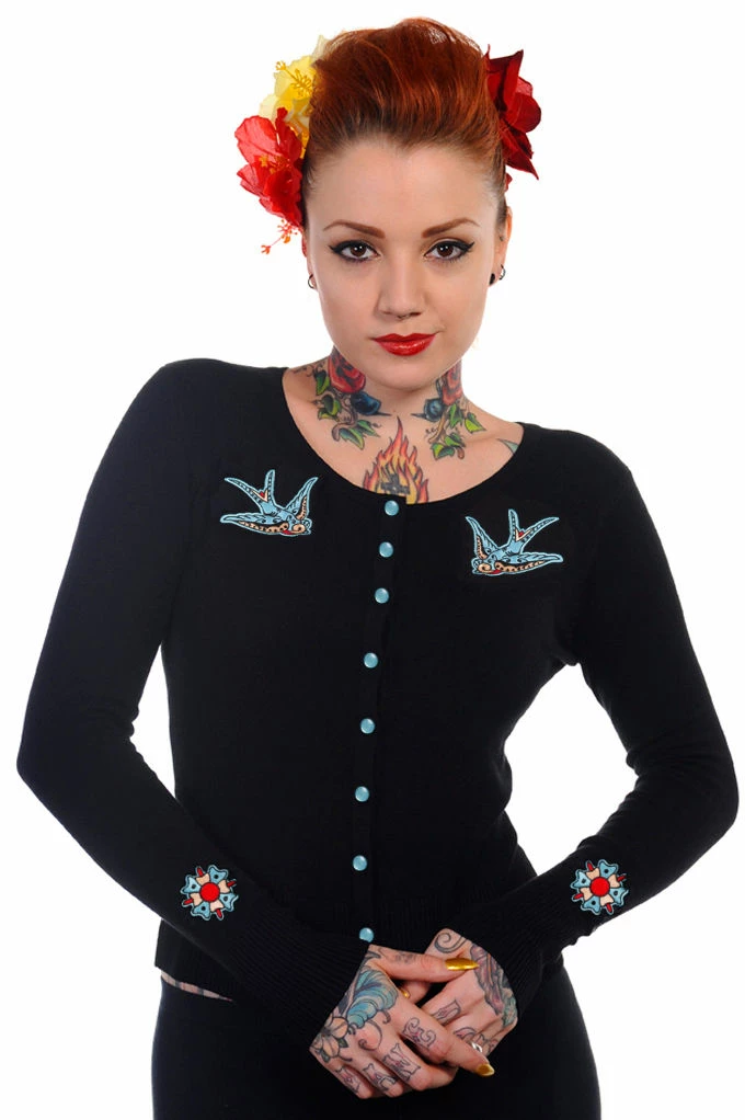 Swallows Cardigan by Banned Super Soft Long Sleeve Rockabilly Gothic Black BlueÂ